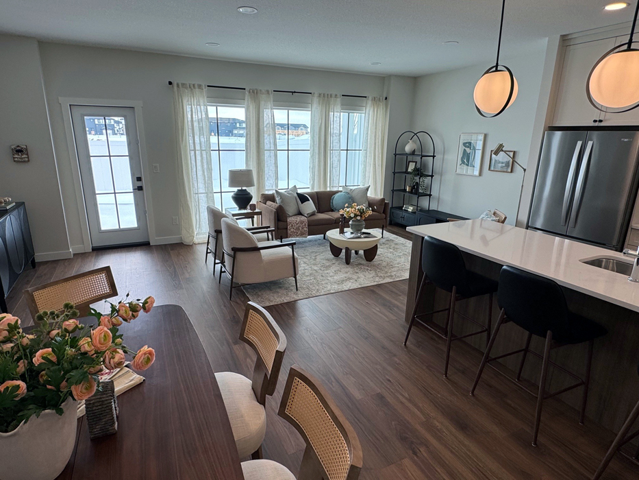 The main floor offers an inviting space for entertaining, with an open-concept living area, chef-style kitchen with a large walk-in pantry, a half-bath, and a spacious living room with floor-to-ceiling windows. These windows reveal a picturesque private backyard complete with a covered patio, low maintenance turf landscaping, and privacy fencing. The master bedroom is a luxurious retreat with a 4-piece ensuite and walk-in closet.